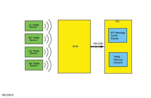 The TPMS (Tire Pressure Monitoring System) system monitors the tire pressure using 4 valve stem mounted TPMS (Tire Pressure Monitoring System) sensors to provide accurate tire pressures. Each individual sensor contains its own battery and transmits tire pressure data to the controlling module. All of the TPMS (Tire Pressure Monitoring System) functions are controlled by the BCM (Body Control Module). The TPMS (Tire Pressure Monitoring System) sensors are trained to the BCM (Body Control Module), which records each TPMS (Tire Pressure Monitoring System) sensor unique identifier. The BCM (Body Control Module) records where each TPMS (Tire Pressure Monitoring System) sensor is located based on the training order and compares the actual tire pressure with the desired tire pressure as indicated on the VC (Vehicle Certification) label. If the tire pressure deviates from the desired tire pressure the BCM (Body Control Module), using the MS-CAN (Medium Speed Controller Area Network), signals the IPC (Instrument Panel Cluster) to illuminate the TPMS (Tire Pressure Monitoring System) warning indicator and also displays a message on the message center. The programmed tire pressure cannot be changed.
