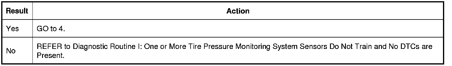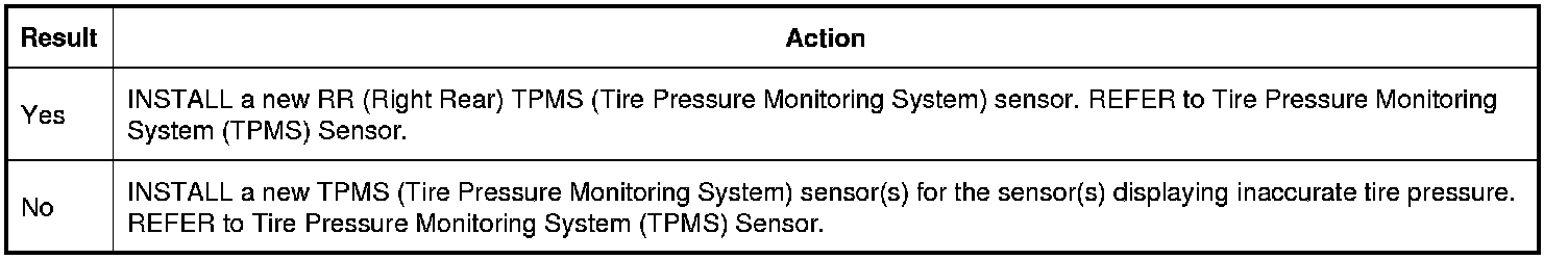 1. Train all 4 TPMS (Tire Pressure Monitoring System) sensors. REFER to Tire Pressure Monitoring System (TPMS) Sensor Training - Intelligent Access (IA) Tire Pressure Monitoring System (TPMS) Sensor Training - Intelligent Access (IA) or REFER to Tire Pressure Monitoring System (TPMS) Sensor Training - Integrated Keyhead Transmitter (IKT) Tire Pressure Monitoring System (TPMS) Sensor Training - Integrated Keyhead Transmitter (IKT).