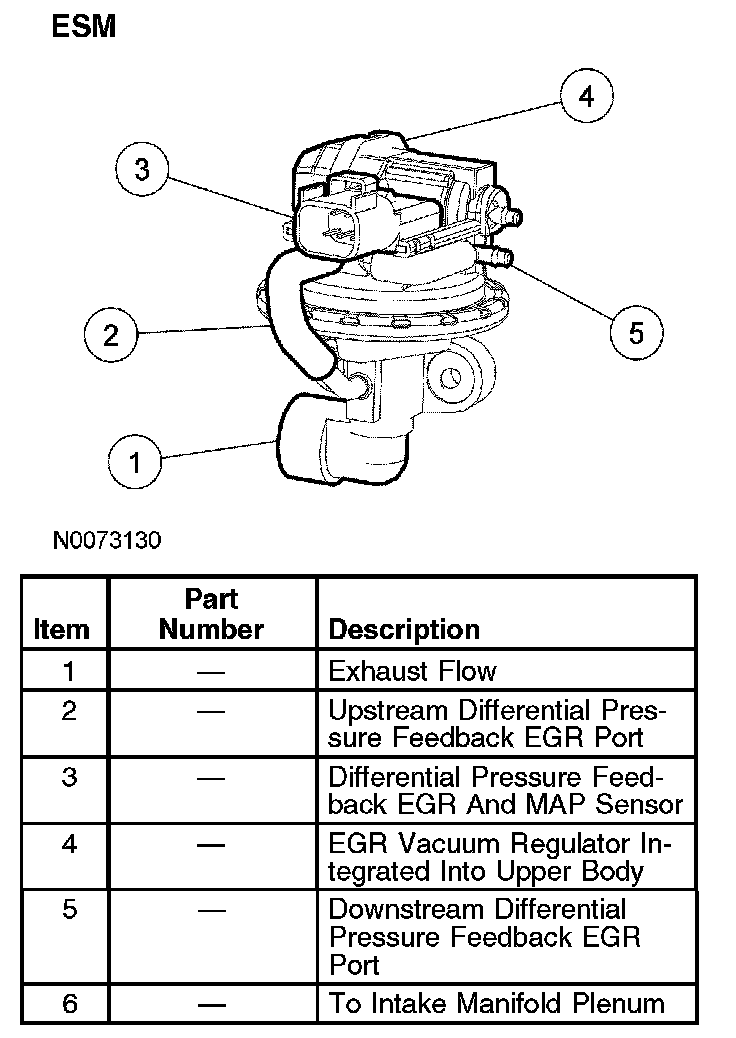 The ESM functions in the same manner as a conventional differential pressure feedback EGR system. The various system components have been integrated into a single component called the ESM. The flange of the valve portion of the ESM bolts directly to the intake manifold with a metal gasket that forms the metering orifice. This arrangement increases system reliability, response time, and system precision. By relocating the EGR orifice from the exhaust to the intake side of the EGR valve, the downstream pressure signal measures manifold absolute pressure. This manifold absolute pressure signal is used for EGR correction and inferred barometric pressure (BARO) at ignition ON. The system provides the PCM with a differential pressure feedback EGR signal that is identical to a traditional differential pressure feedback EGR system.
