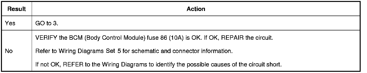 Verify BCM (Body Control Module) fuse 86 (10A) is OK.