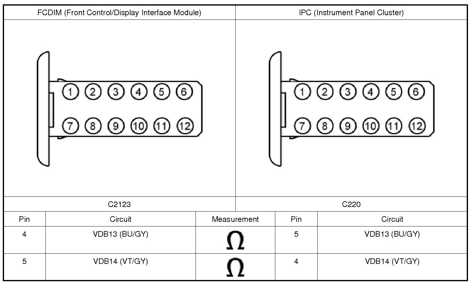 3. CHECK THE I-CAN (Infotainment Controller Area Network) CIRCUITS BETWEEN THE FCDIM (Front Control/Display Interface Module) AND THE IPC (Instrument Panel Cluster) FOR AN OPEN