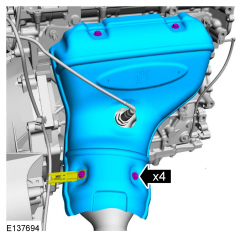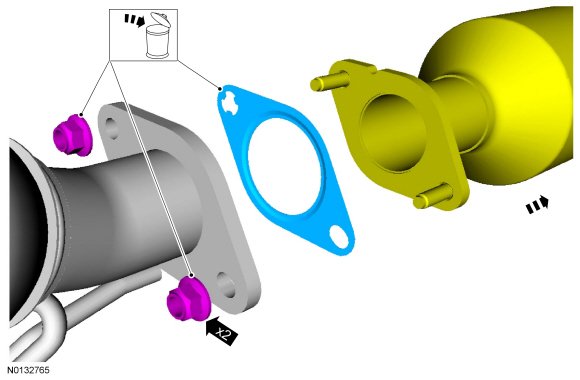 8. NOTICE: Failure to tighten the catalytic converter manifold-to-muffler and tailpipe nuts to specification in this sequence may cause the catalytic converter manifold-to-muffler and tailpipe flange to develop an exhaust leak.