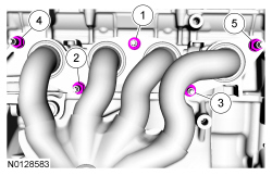 During installation, install 5 new catalytic converter manifold-to-cylinder head nuts and tighten in 2 stages in the sequence shown.