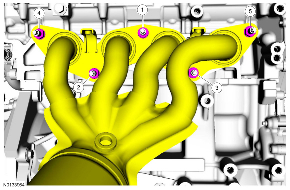 Using a new gasket, position the catalytic converter and install the 5 catalytic converter manifold-to-cylinder head nuts and tighten in 2 stages in the sequence shown.