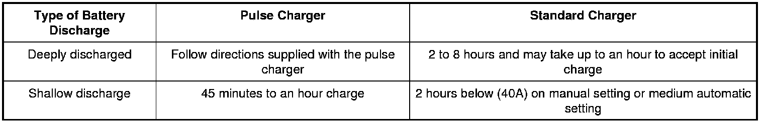 NOTE: Battery chargers have improved greatly with the addition of the new generation pulse chargers. These chargers pulse current into the battery, breaking down the sulfation layer on the battery plates and generally reduce charging times to less than an hour.