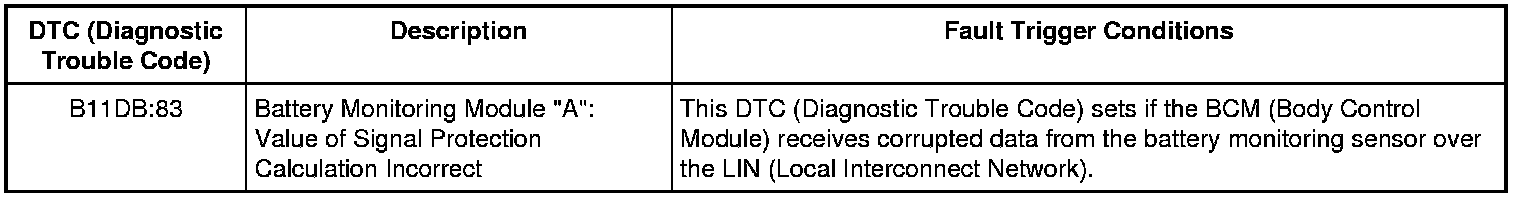 The BCM (Body Control Module) monitors the battery state of charge using the battery monitoring sensor attached to the negative battery cable. Battery voltage is hardwired to the battery monitoring sensor and data is transferred from the battery monitoring sensor to the BCM (Body Control Module) via a LIN (Local Interconnect Network) circuit.