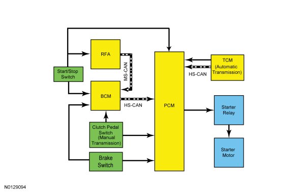 The start/stop switch is connected to the RFA (Remote Function Actuator) module and the BCM (Body Control Module) as a backup in case of a failure. If there is a circuit failure to either module from the start/stop switch, the modules communicate the start/stop switch request to each other over the MS-CAN (Medium Speed Controller Area Network).