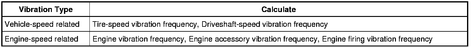 Use the engine rpm where the vibration symptom occurs to determine engine frequency. Calculate engine frequency by dividing the engine rpm by 60 (the number of seconds in a minute). For example, if the corresponding engine rpm of a vibration concern on a vehicle is 2,400 rpm, the resulting engine frequency is 40 Hz. Therefore, a 40 Hz vibration is a first order engine vibration. For purposes of vibration diagnosis, the engine also includes the torque converter and exhaust system.