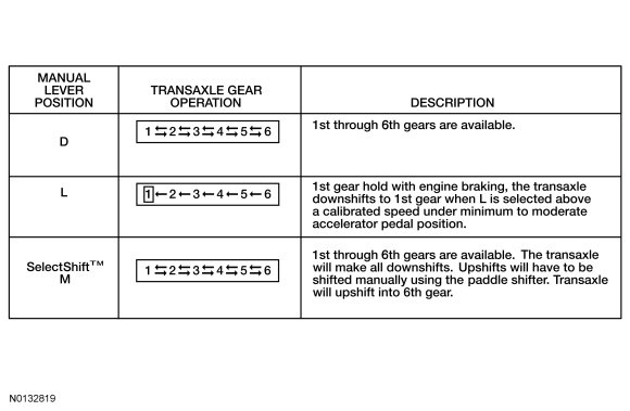 This transaxle has 5 range positions: P, R, N, D and M for vehicles equipped with SelectShift(TM) .
