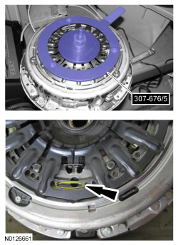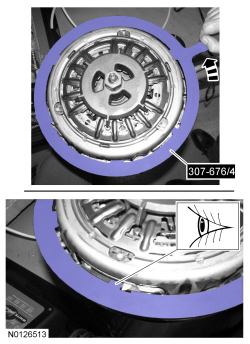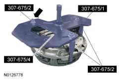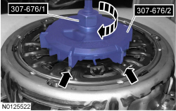 Using 307-676 /1 and 307-676 /2, compress the clutch to the stops on the clutch. The locks on clutch 2 lock at this time.