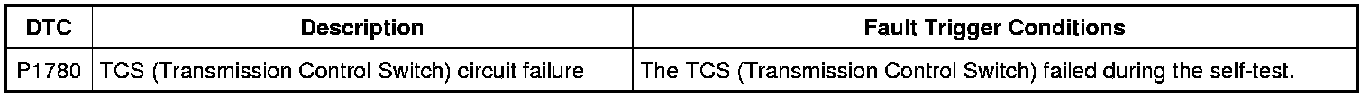 The TCS (Transmission Control Switch) is a momentary contact switch located on the selector lever. Pressing the TCS (Transmission Control Switch) will engage or disengage the O/D (Overdrive) function of the transmission. When the O/D (Overdrive) is disengaged, the O/D (Overdrive) icon will illuminate OFF on the IPC (Instrument Panel Cluster). Each time the ignition switch is cycled, the transmission will automatically provide O/D (Overdrive) operation regardless of TCS (Transmission Control Switch) position the last time the engine was running.
