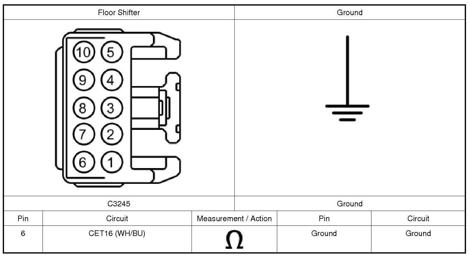 2. Measure the resistance of circuit CET16 (WH/BU) from floor shifter C3245 to ground.