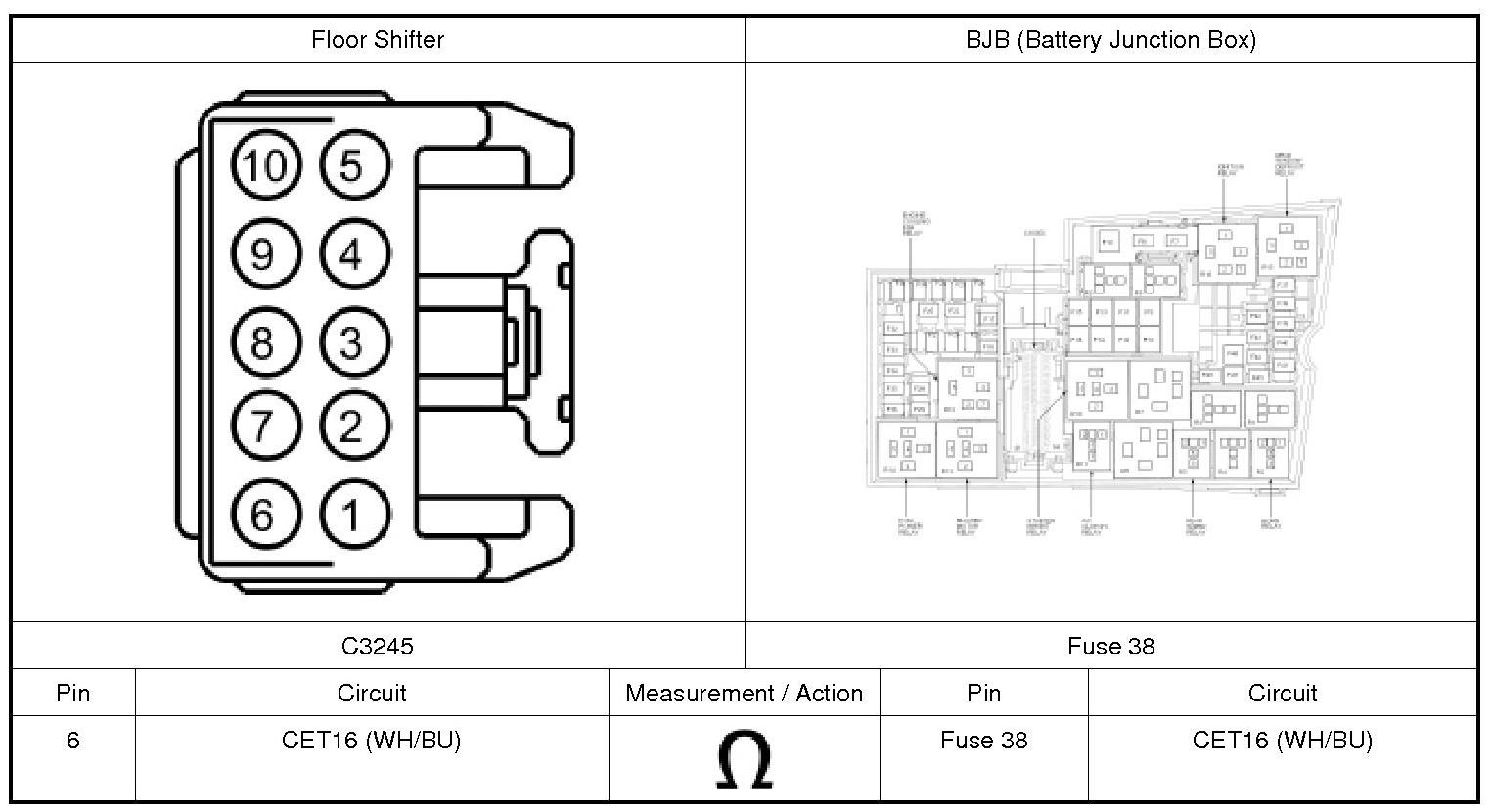 2. Measure the resistance of circuit CET16 (WH/BU) from floor shifter C3245-6 to BJB (Battery Junction Box) fuse 38.