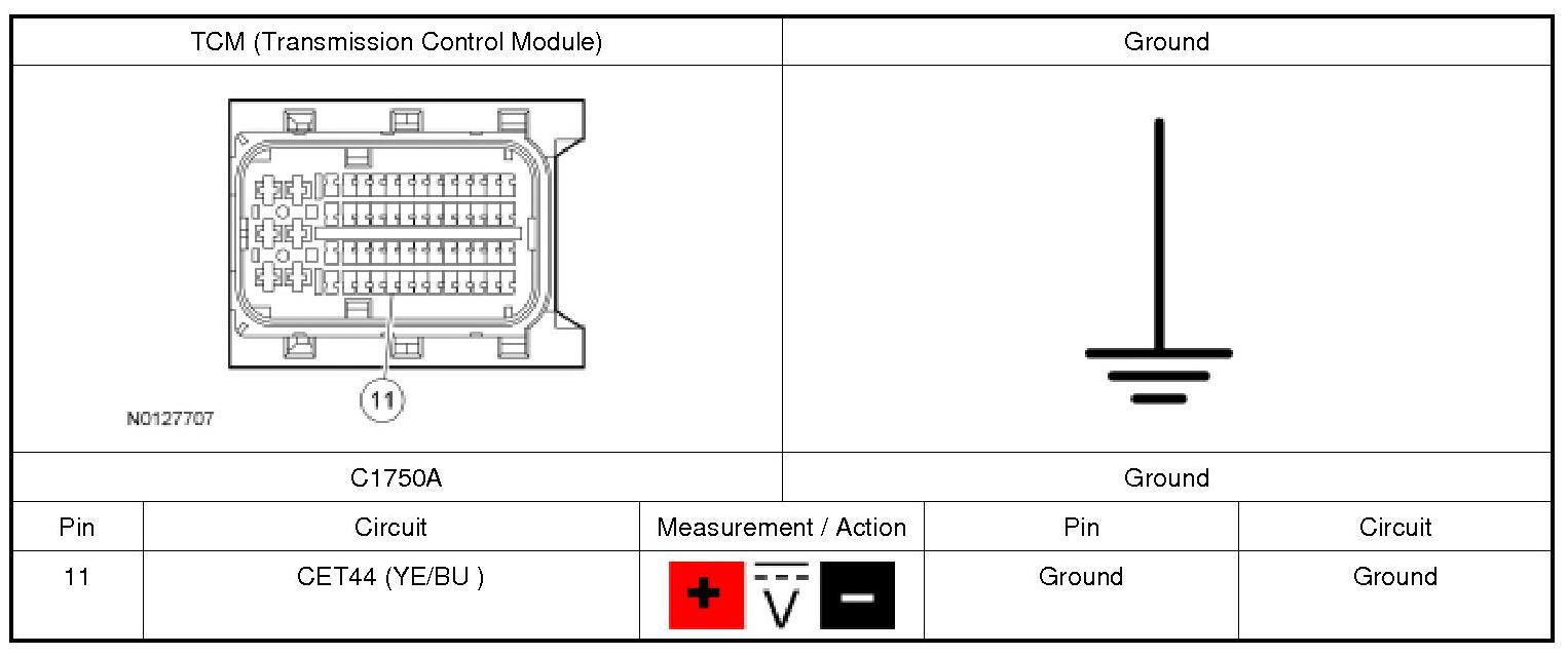 4. Measure the voltage on circuit CET44 (YE/BU) at the TCM (Transmission Control Module) C1750A-11 to ground while cycling the TCS (Transmission Control Switch).