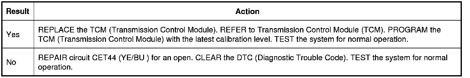 2. Measure the resistance of circuit CET44 (YE/BU) between floor shifter C3245-5 to the TCM (Transmission Control Module) C1750A-11.