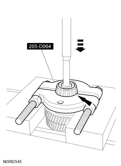 Reposition the input shaft with 5th gear end facing upward. Using a press and 205-D064 (D84L-1123-A) , remove the roller bearing.