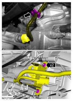 - Tighten the top 2 exhaust support bracket bolts to 50 Nm (37 lb-ft).