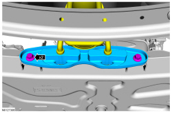 25. Install the transmission support insulator with the battery tray support bracket and connect the wiring retainers. Install the 4 transmission support insulator nuts and the transmission support insulator bolt.