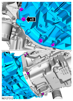1. Install the transmission. Install the 8 clutch housing-to-engine bolts.