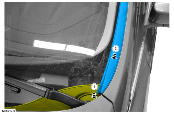 2. NOTICE: Make sure the windshield applique clips are fully dis-engaged prior to removing the applique or damage to the component and bracket can occur.