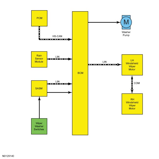 The windshield wiper/washer system is ready for operation when the ignition is ON. The SASM (Steering Angle Sensor Module) measures a voltage drop across the wiper/washer switch based on the wiper/washer switch position (OFF, LOW, HIGH or 1 of the 5 auto/intermittent positions). The SASM (Steering Angle Sensor Module) sends a message to the BCM (Body Control Module) over a LIN (Local Interconnect Network) based on the measured voltage drop. The BCM (Body Control Module) then sends a command to the LH (Left Hand) (driver side) wiper motor, over a separate LIN (Local Interconnect Network), which shares this message with the RH (Right Hand) (passenger side) wiper motor over a private communication circuit. The wiper motors respond by operating in the selected mode; low speed, high speed or 1 of the 5 auto/intermittent settings.