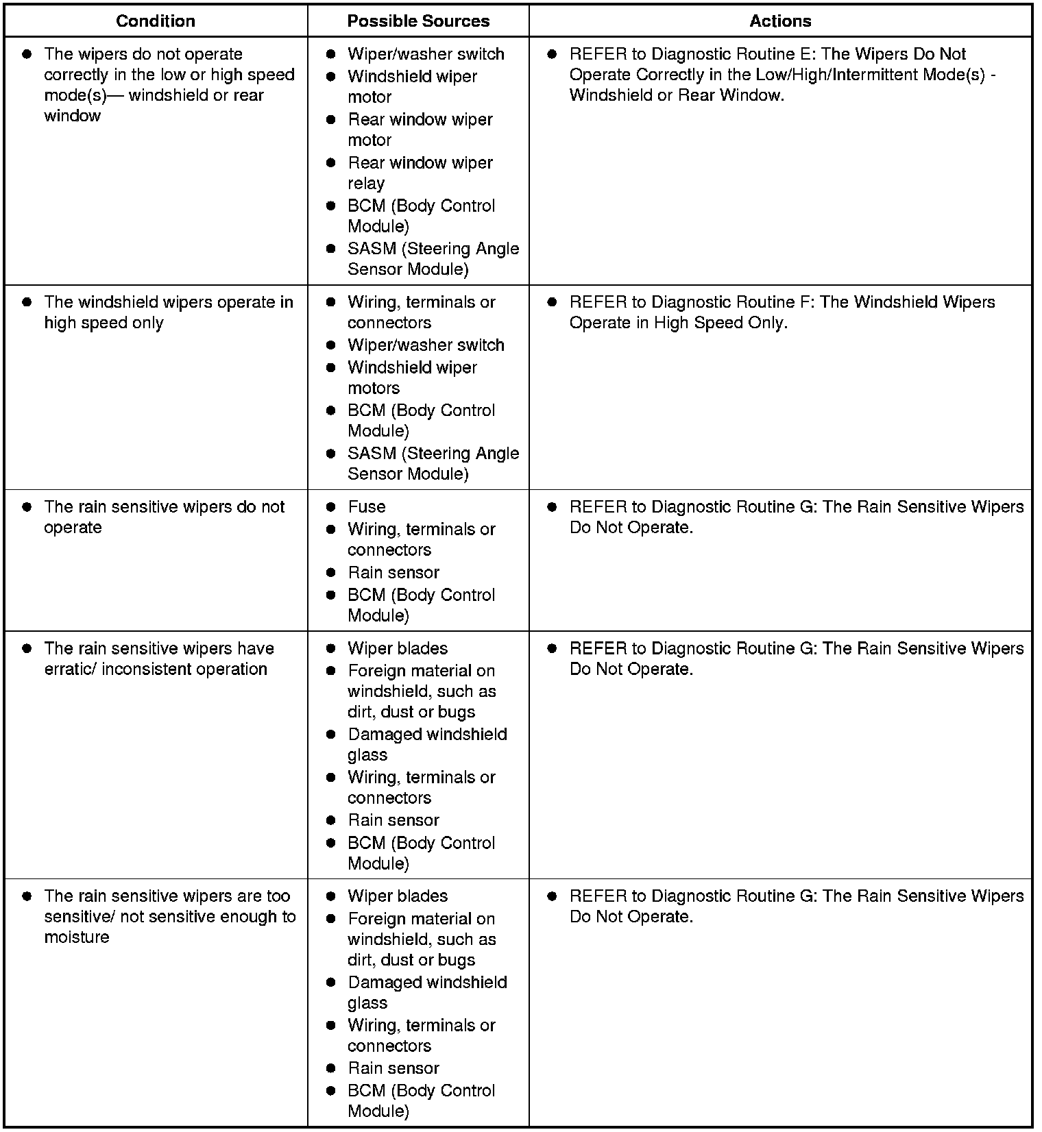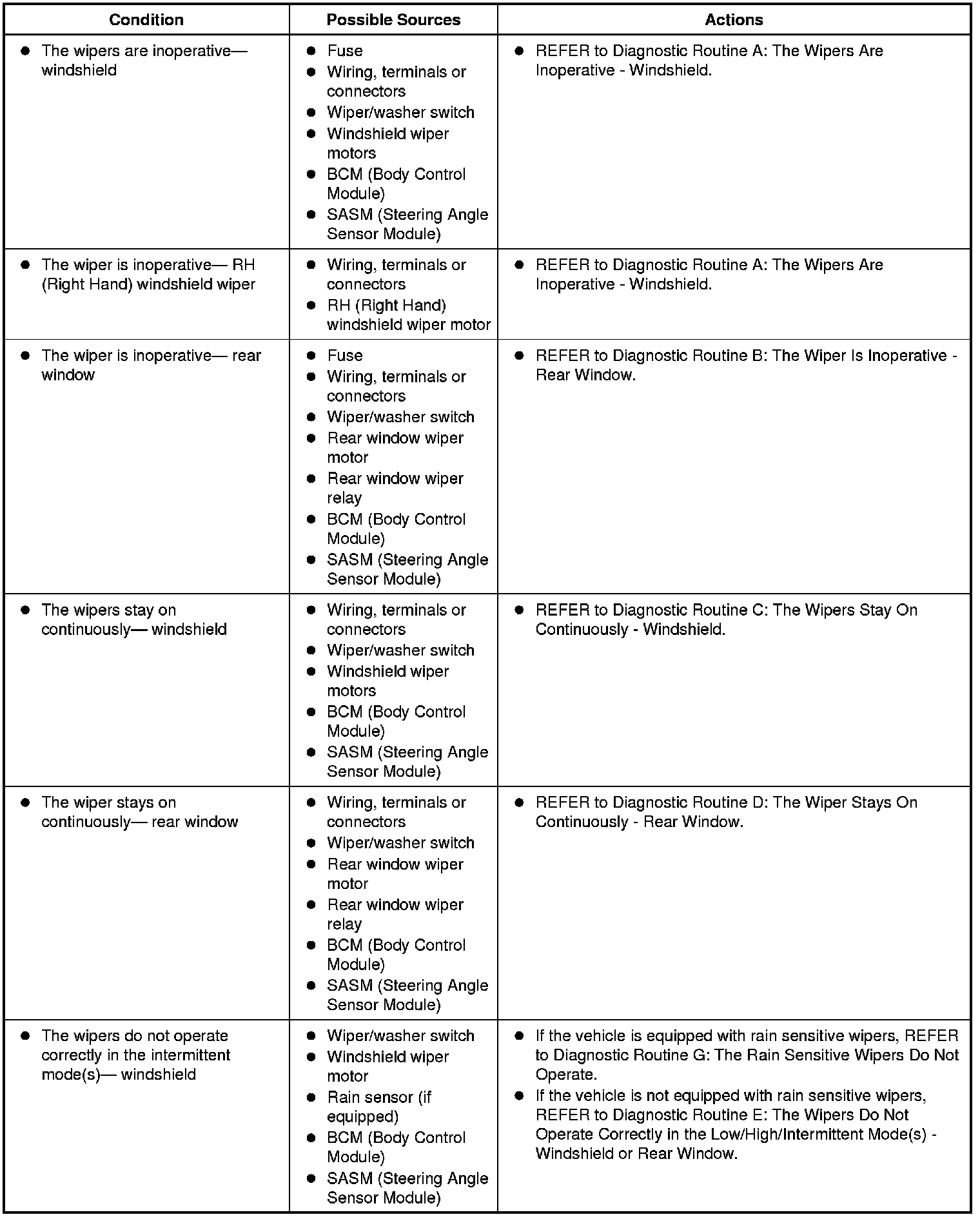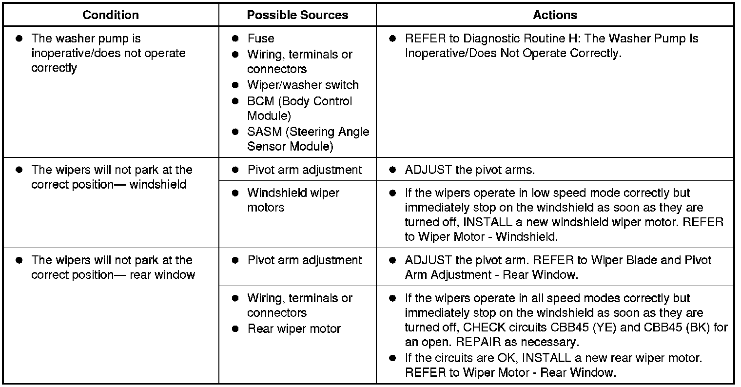 Symptom Chart: Wiper and Washer