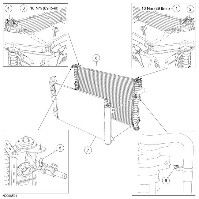 10. Squeeze the tabs and separate the A/C condenser from the radiator.
