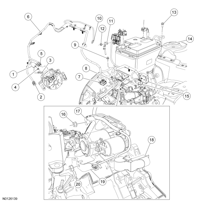 26. Disconnect the battery cable retainer and the generator electrical connector.
