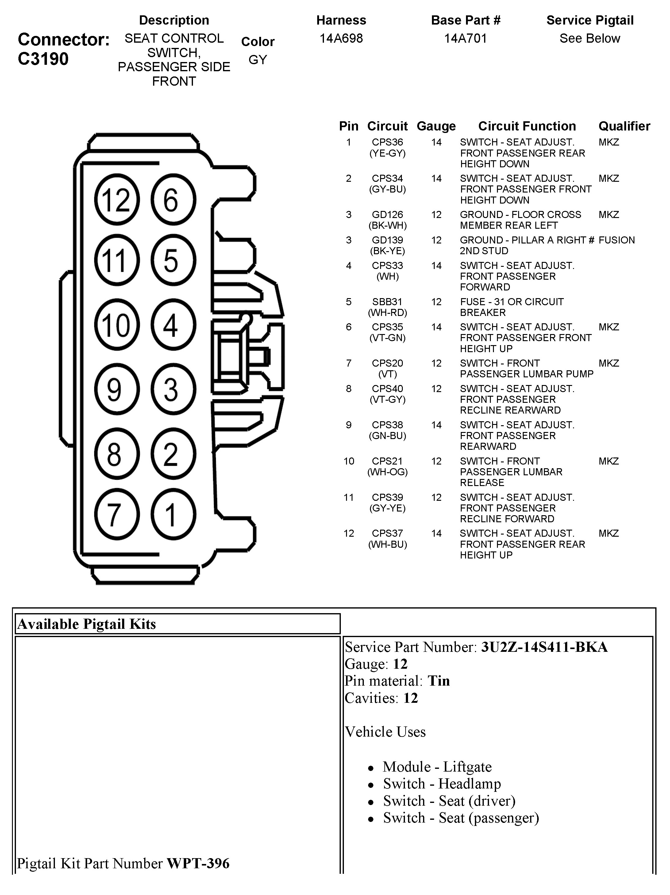 C3190 Seat Control Switch, Passenger Side Front
