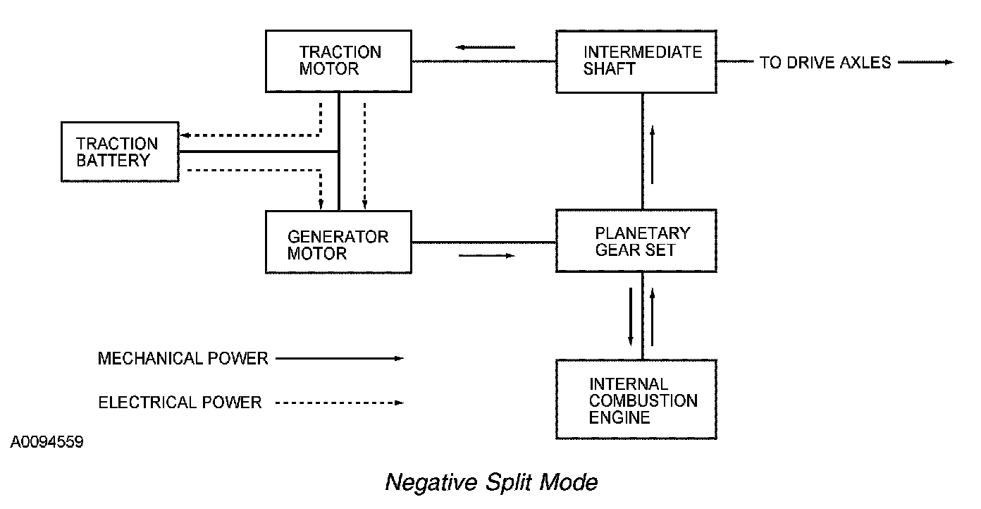The hybrid electric system operates in the electric mode when the vehicle is propelled by the electrical power stored in the high voltage traction battery. The torque is supplied to the output shafts by the traction motor, the generator motor, or a combination of both. This is a preferred mode whenever the desired torque is low and the electrical system, rather than the engine, can produce it more efficiently. The electric mode is also used in reverse because the engine can deliver torque only in a forward direction.
