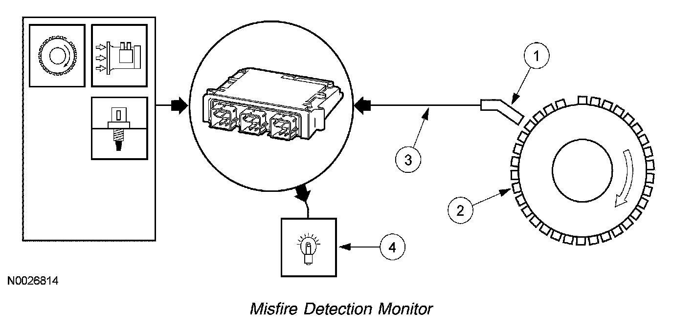 MISFIRE DETECTION MONITORThe misfire detection monitor is an on board strategy designed to monitor engine misfire and identify the specific cylinder in which the misfire has occurred. Misfire is defined as lack of combustion in a cylinder due to absence of spark, incorrect fuel metering, incorrect compression, or any other cause. The misfire detection monitor is enabled only when certain base engine conditions are first satisfied. Input from the cylinder head temperature (CHT), mass air flow (MAF), and crankshaft position (CKP) sensors is required to enable the monitor. The misfire detection monitor is also carried out during an on-demand self-test.