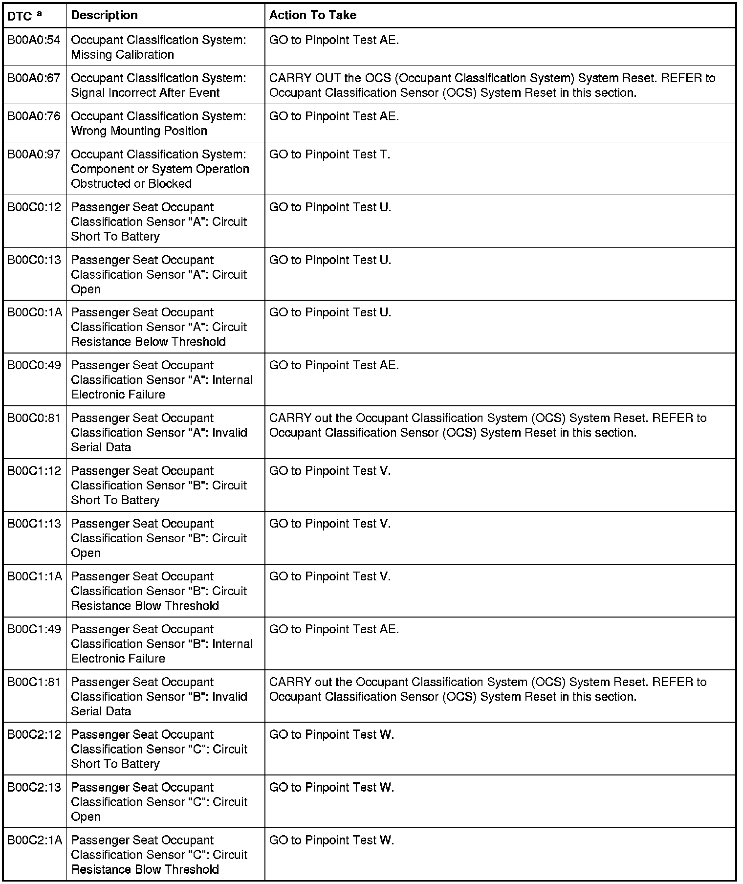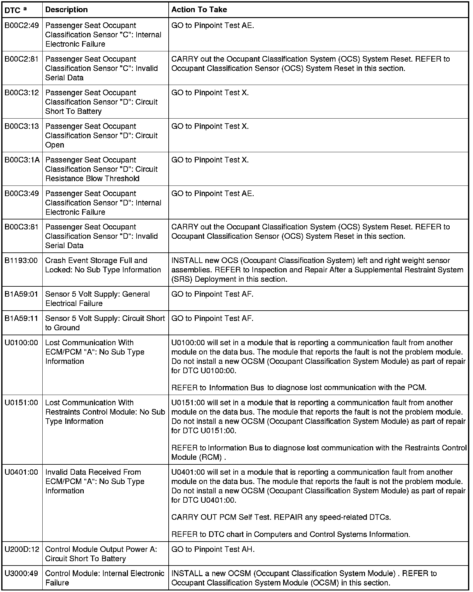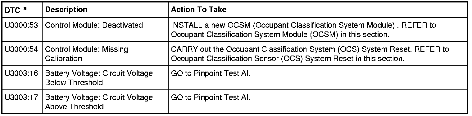 Occupant Classification System Module (OCSM) DTC Chart