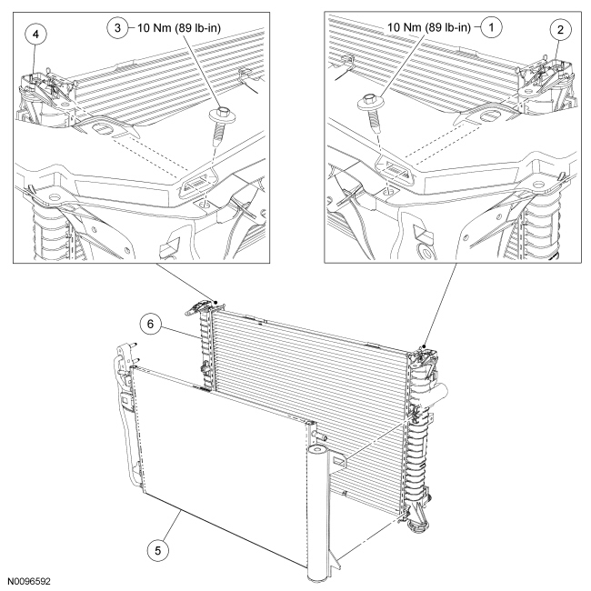 9. Squeeze the tabs and separate the A/C condenser from the radiator.