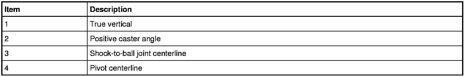 Caster is the deviation from vertical of an imaginary line drawn through the ball joints when viewed from the side. The caster specifications will give the vehicle the best directional stability characteristics when loaded and driven. The caster setting is not related to tire wear.