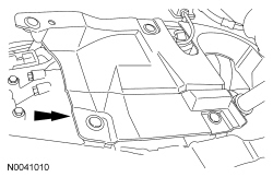 4. Position the LH front structure-to-subframe splash shield in place and install the 6 pin-type retainers.