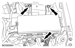 12. Remove the 2 bolts and the nut and position the BJB (Battery Junction Box) aside far enough to gain access to the top 2 transaxle support insulator bolts.