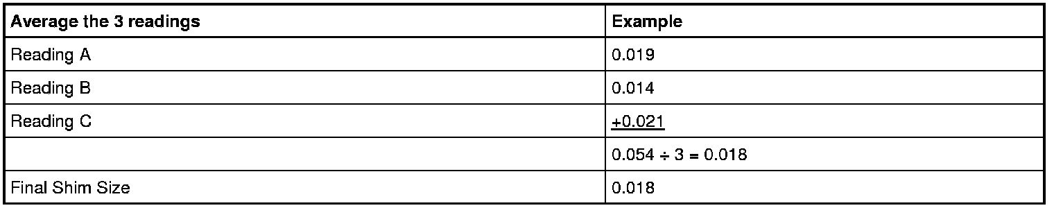 - Take and record 3 readings within 0.10 mm (0.003 in) of each other. Use the formula below to select the correct shim size.