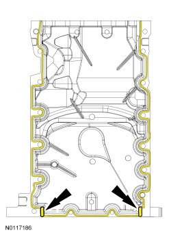 31. Apply a 5.5 mm (0.21 in) bead of Motorcraft(R) High Performance Engine RTV Silicone to the 2 crankshaft seal retainer plate-to-cylinder block joint areas on the sealing surface of the oil pan.