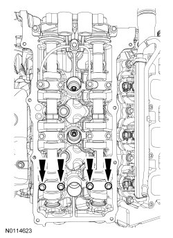 78. Install the 2 new LH VCT (Variable Camshaft Timing) bolts and tighten in 4 stages.