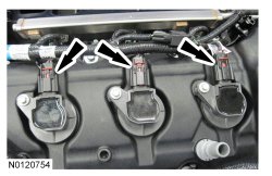 158. Connect the 3 LH ignition coil-on-plug electrical connectors.