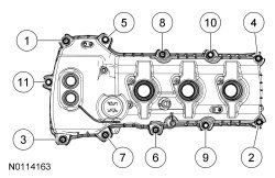 NOTE: If the valve cover is not installed and the fasteners tightened within 4 minutes, the sealant must be removed and the sealing area cleaned. To clean the sealing area, use silicone gasket remover and metal surface prep. Failure to follow this procedure can cause future oil leakage.