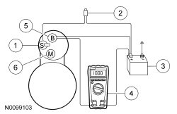 7. Remove the cables from solenoid B, S and M-terminals. Clean the cables and connections and reinstall the cables to the correct terminals. Repeat Steps 3 through 6. If the voltage drop reading is still greater than 0.5 volt when checked at the M-terminal and less than 0.5 volt when checked at the B-terminal, the concern is in the solenoid contacts. Install a new starter motor.