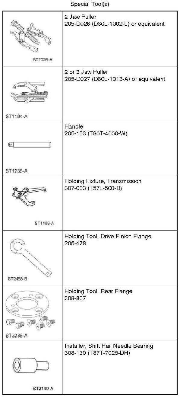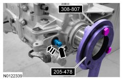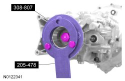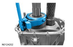 8. Install the Rear Flange Holding Tool and the Drive Pinion Flange Holding Tool. Position the shift shaft into 4th gear.