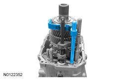 24. Using the Push/Puller Set, Step Plate and the Synchro Gear Pack Remover, remove the 1st gear, the reverse gear and the reverse gear synchronizer assembly.