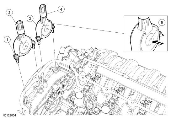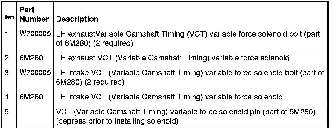 NOTICE: The Variable Camshaft Timing (VCT) variable force solenoid pins must be fully depressed to avoid interference with the VCT (Variable Camshaft Timing) valve tips during installation. Failure to follow these instructions can result in damage to the engine.