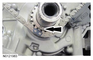 Align the colored link on the timing chain with the timing mark on the LH VCT assembly.