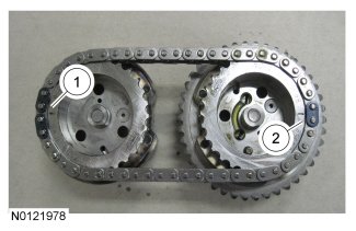 The timing mark on the intake VCT assembly should align between the 2 consecutive colored links.