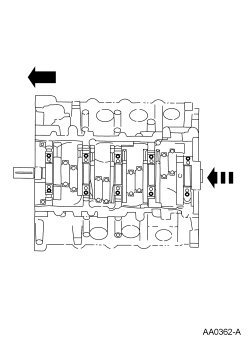 Install the lower crankshaft thrust washer to the back side of the No. 5 main bearing cap, with the tab aligned with the cutout in the main bearing cap.