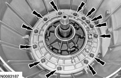 49. Install 13 new front pump-to-case bolts and washers. Tighten in a crisscross pattern.