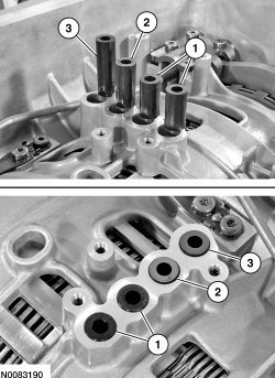 52. Rotate the transmission in the horizontal position with the main control area facing up and install 4 new center support feed tubes.